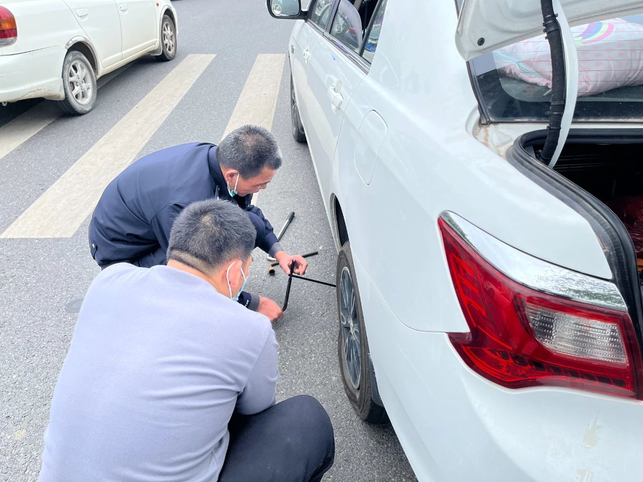 大年初五下午,交警在疏导交通时化身“修理工”,帮助一求助车辆更换轮胎,及时为群众排忧解难,消除安全隐患,受到群众称赞。