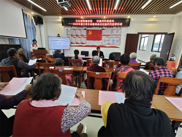 活动伊始,洞表村党支部书记严国锋表示:“村规民约不是束缚,而是给大家减负担、添幸福的‘金钥匙’。今天我们坐在一起,主要是聊聊大家关心的红白事如何省心省钱有面子”。现场掌声雷动。随后,严国锋用“新兴话”详细解读《洞表村村规民约》中关于婚事新办、丧事简办等核心内容:婚事简办不铺张,彩礼礼金要适度,禁止盲目攀比,摒弃低俗婚闹、恶俗仪式,鼓励集体婚礼、公益婚礼等简约形式,弘扬勤俭节约美德;丧事推行简办快办,取消封建迷信仪式,倡导生态安葬、文明祭祀,用鲜花祭扫替代焚烧纸扎,缩短治丧周期,节约人力物力。同时,通过身边典型案例分享,讲述了因高额彩礼导致新人婚后负债累累、矛盾频发的反面案例,重点阐释了“薄养厚葬非孝子,全看活时衣食情”的理念,宣讲环节让人动容。