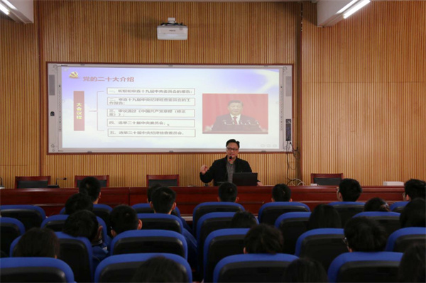 陆校长详细介绍了党的二十大召开的重要意义和党的二十大报告中15个方面的重要内容,引导同学们自觉关注国家大事,帮助学生培养政治认同意识,提高学生公共参与的能力。为了帮助同学们能够更好领会报告的精神,陆校长还结合本校实际和运用现实案例来深入浅出地解读报告精神。课堂上同学们聚精会神,听得津津有味。