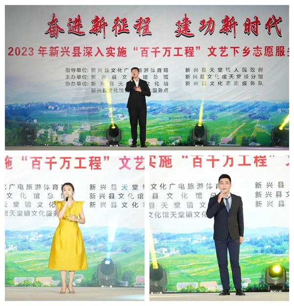 为深入实施“百县千镇万村高质量发展工程”,高质量推进乡村全面振兴,高起点推动农业农村发展,高标准推进生态文明建设,高水平持续增进民生福祉。以培育和践行社会主义核心价值观为根本,以高质量文化供给增强人民群众的文化获得感、幸福感。2023年10月8日,由新兴县文化广电旅游体育局、各镇政府作为指导单位,新兴县文化馆总馆、新兴县文化馆各镇分馆主办,各镇文化站、文化志愿服务队、各镇文化服务点协办的“奋进新征程 建功新时代——2023年新兴县深入实施“百千万工程”文艺下乡志愿服务活动”正式启动,首场演出走进天堂镇元头岗村村委。