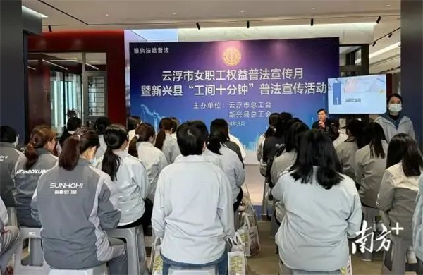 3月19日下午,由云浮市、新兴县总工会主办的云浮市女职工权益普法宣传月暨新兴县“工间十分钟”普法宣传活动在新豪轩科技(新兴)有限公司举行,进一步增强企业职工学法、守法、尊法、用法意识。