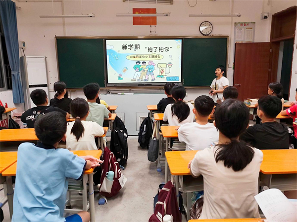 面对开学初普遍存在的“开学综合征”,学校在9月第一周全面启动“新学期,拍了拍你”收心主题班会课程。各班班主任精心设计班会流程,通过"假期趣事分享"让学生们坦然告别假期;“新学期展望”环节鼓励学生表达期待与担忧;最后通过“重温班规班约”,师生共同建立行为规范。1900多名学生在这场情感共鸣中完成了心理状态的平稳过渡,为新学期奠定了坚实基础。