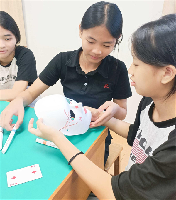 心理社团课上,“情绪面具”课为社团学生提供了独特的情绪表达空间。空白面具胚在学生们手中变成情感的载体:外部装饰展示着愿意呈现的形象,内部则书写着不愿轻易表露的真实感受。这种非言语的表达方式让学生们得以安全地宣泄情绪,完成了一次深刻的心灵对话。